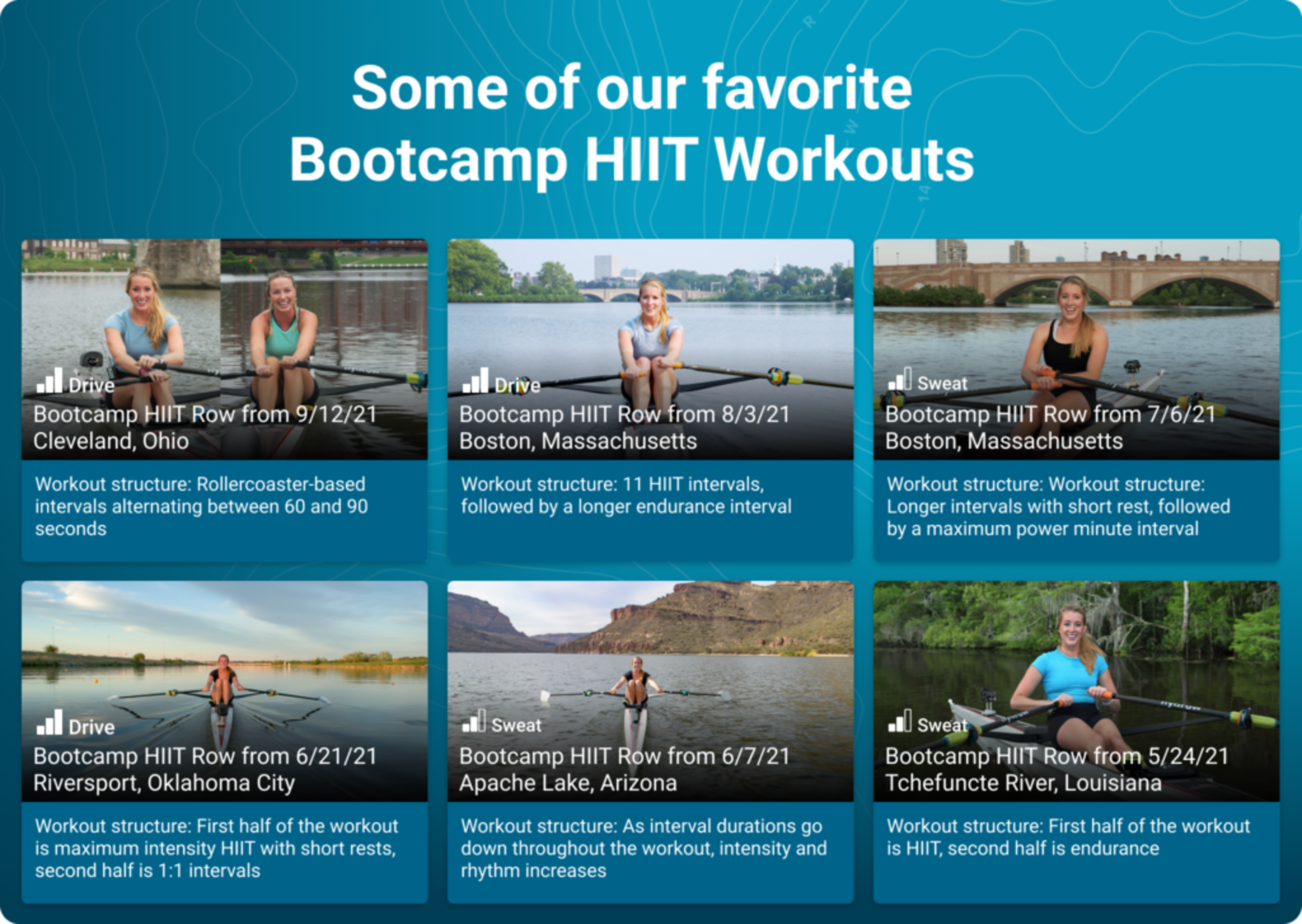 They’re efficient: Bootcamp HIIT Rows are an efficient way to improve both cardiovascular fitness and strength in one workout. A 20-minute Bootcamp HIIT Row gives you a full-body cardio and strength workout in half the time it would take on a bike or other at-home fitness workout!